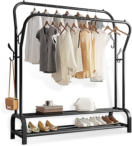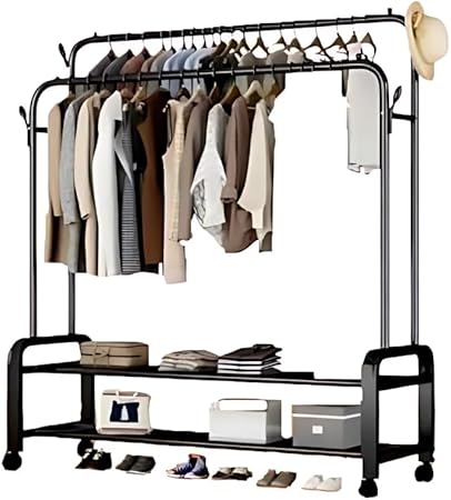 Fabriqué en métal et en fer résistants, ce portant supporte jusqu’à 48 kg et se compose de deux barres robustes et d’une élégante finition mate disponible en noir ou en blanc. Grâce à ses dimensions généreuses et à son agencement bien pensé, il est idéal pour suspendre manteaux, robes ou vestes et peut même accueillir des boîtes ou des chaussures en dessous.