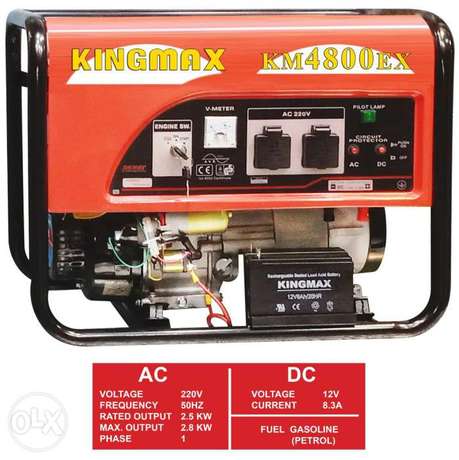 Le groupe électrogène kingmax -KM4800EX est un générateur mobile de haute qualité avec brosse, auto-stimulant, bipolaire et triphasée avec une puissance de 2,5 kVa. La machine possède un système de démarrage électrique  facile et elle est faible en  consommation de gazole.il est utilisé dans deux cas: Les zones ou le réseau de distribution électrique ne dessert pas ou pallier une éventuelle coupure d’alimentation électrique.