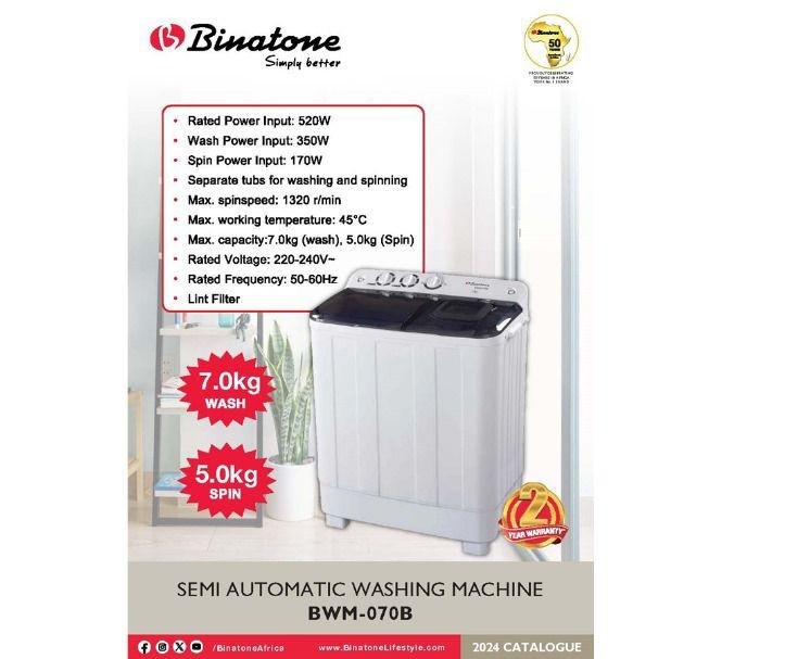 Machine à Laver Semi-automatique 7kg – Binatone – BWM-070B