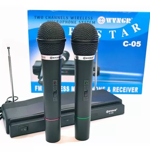 Caractéristiques : Double radio microphone système convient pour chanteurs professionnels sur scène en petits bars et pubs, mobile disque et karaoké, et l’usage domestique Pop/amortisseur Protection contre le bruit Microphone dynamique Voice Coil Facile à utiliser et alternative économique qui est idéale pour les réunions, événements, des discours, etc. Connecte à la plupart audio appareils qui ont entrées micro.(guitare amplificateur, machines pour le karaoké, etc.) 2 microphones, 1 récepteur avec construit en deux antennes à disparition 1 °Câble jack 6,35mmspecifiche : plage de fréquences : fm121.7- 128,7 MHz Réponse en fréquence : 100 hz-10000hz (plusmn ; dB). distorsion audio : moins de 1%. Plage dynamique : dB. Tension : 220 V Distance 10 mètres Microphone émetteur : Type d’émission : FM Rapport s/N : mieux de dB. Puissance de sortie RF : 8 mW (50mW maximum) déviation de fréquence : 75 kHz Batterie : batterie de 9 V (non incluses) récepteur : type de récepteur : FM