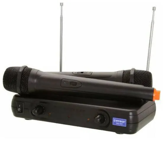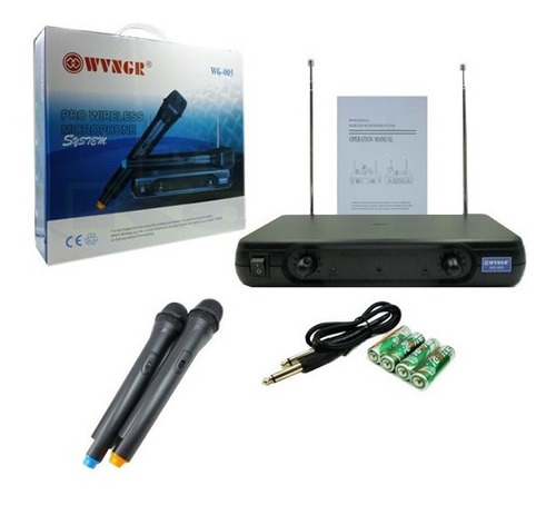 Double microphone sans fil WG-005 d’excellente qualité pour le karaoké, ils fonctionnent avec des piles “AA”, vous pouvez les utiliser à une distance allant jusqu’à 30 m du récepteur avec une qualité sonore garantie.