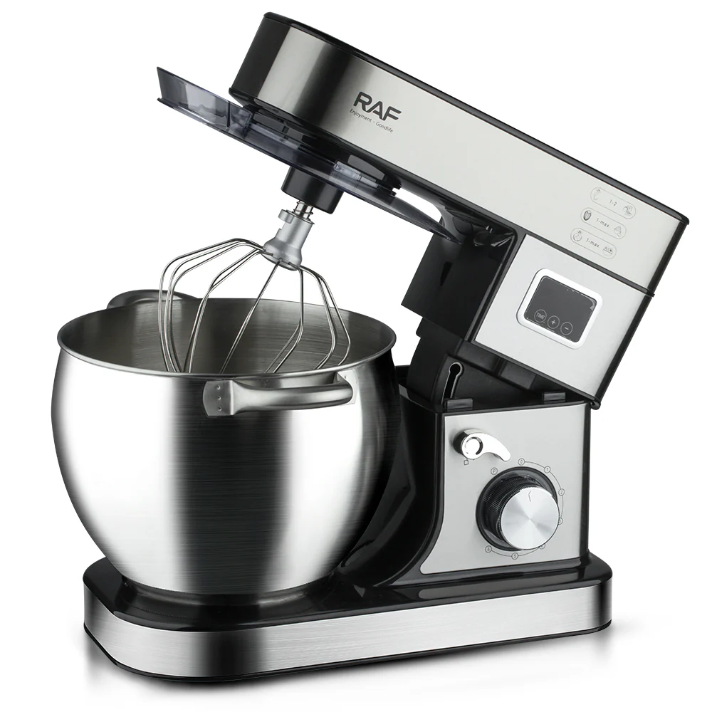 Moteur en cuivre puissant avec plaque électrique Hall Puissance nominale : 1800 W Réglage de la vitesse : 6 vitesses avec interrupteur à LED turbo Matériau : boîtier en ABS, bol en acier inoxydable Trois jeux de pièces de rechange (crochet pétrisseur, batteur plat, fouet métallique) Avec affichage LED du temps de travail Bol de mixage en acier inoxydable de 8 L Conception à faible bruit Pièces détachables faciles à nettoyer Rotation planétaire avec conception anti-fuite pour mélanger soigneusement et en toute sécurité Pieds en caoutchouc antidérapants Mécanisme de levage avec interrupteur de sécurité pour une utilisation sûre et facile 220-240 V, 50-60 Hz