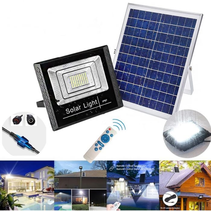 Kit qui comprend un projecteur solaire LED avec une batterie au lithium intégrée haute puissance , un panneau solaire, une télécommande et du matériel pour l’installation. Il intègre des capteurs de lumière. Idéal pour éclairer automatiquement n’importe quel espace extérieur sans avoir besoin d’électricité.