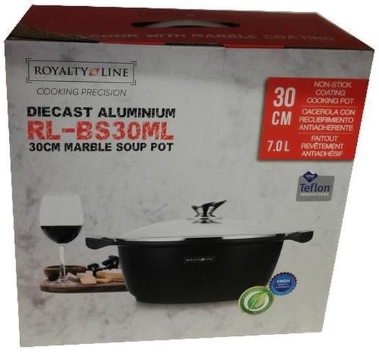 La cocotte en marbre Royalty Line de 30 CM a une capacité de 4,7 litres. Pour ceux qui souhaitent avoir une casserole plus grande, c’est l’un des meilleurs modèles. La cocotte est très appropriée pour les ragoûts plus grands pour toute la famille ou pour les plats avec de gros morceaux / cuisses de viande. De plus, cette casserole peut également être utilisée pour faire frire des croustillons ou comme friteuse.