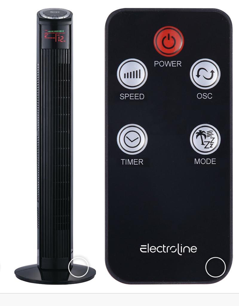 Electroline VTT37R. Type: Ventilateur de tour domestique, Couleur du produit: Noir, Conception de caisse: Sol. Type d’alimentation d’énergie: AC, Consommation: 45 W, Tension d’entrée AC: 220 – 240 V. Largeur: 300 mm, Profondeur: 300 mm, Hauteur: 980 mm. Largeur du colis: 205 mm, Profondeur du colis: 975 mm, Hauteur du colis: 195 mm